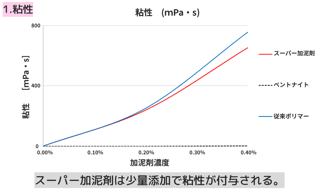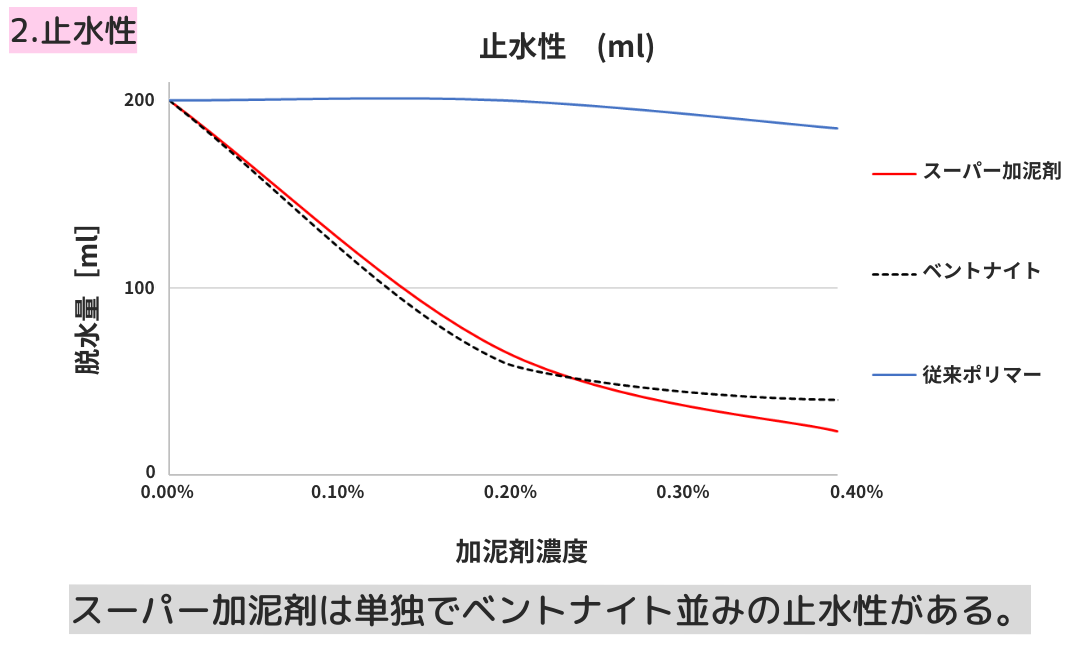 本製品は止水性を備えているため、従来必要とされていたベントナイトが不要になります。下記のグラフが示す通り、スーパー加泥剤単独でベントナイト並みの止水性があります。